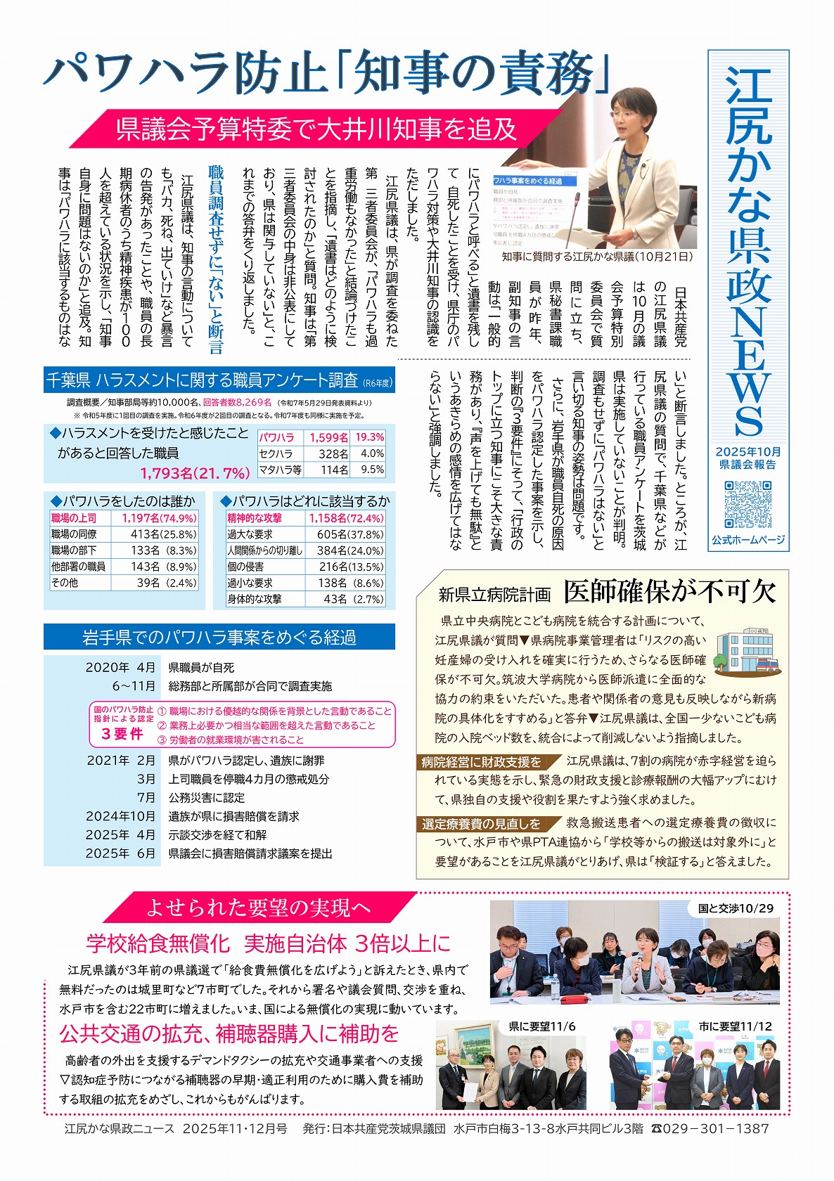 日本共産党の江尻県議は10月の議会予算特別委員会で質問に立ち、県秘書課職員が昨年、副知事の言動は「一般的にパワハラと呼べる」と遺書を残して自死したことを受け、県庁のパワハラ対策や大井川知事の認識をただしました。