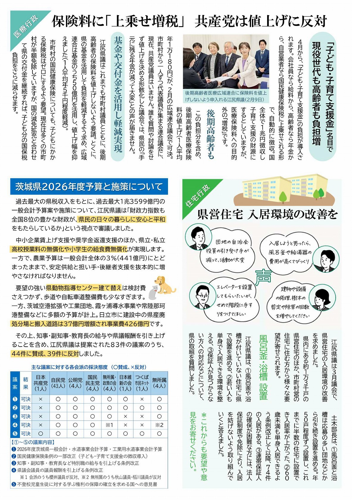 一方、茨城空港拡張や工業団地、霞ヶ浦導水事業や常陸那珂港整備などに多額の予算が計上。日立市に建設中の県産廃処分場と搬入道路は37億円増額され事業費426億円です。その上、知事・副知事・教育長の給与や県議報酬を引き上げることを含め、江尻県議は提案された83件の議案のうち。44件に賛成、39件に反対しました。